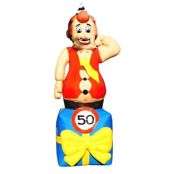 Deze opblaasbare abraham jong wordt veel verhuurd voor abraham's die zich altijd jong voelen! De opblaasbare abraham zit op een cadeau en het bloesje past eigenlijk niet meer.