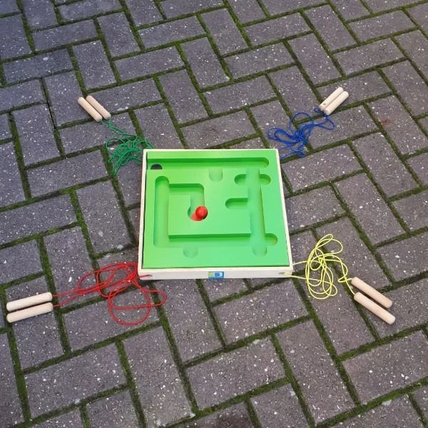 Met meerdere personen een bal naar de stip coördineren. Goed overleg en een goede samenwerking is van belang! Wie is goed in samenwerken en wie kan er slecht luisteren? Met dit spel kom je het te weten.