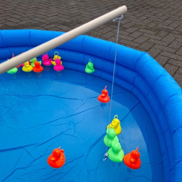 Het spel werkt als volgt: je hebt een klein zwembadje waar de eendjes in drijven. Met een hengel, voorzien van een haakje, probeer je de eendjes te vangen. Hoe sneller je de juiste eendjes hebt gevangen, hoe meer punten je verzamelt. Het maakt het spel niet alleen spannend, maar ook superleuk. Eendjes vissen is niet alleen een test van behendigheid maar je moet ook goed coordineren.