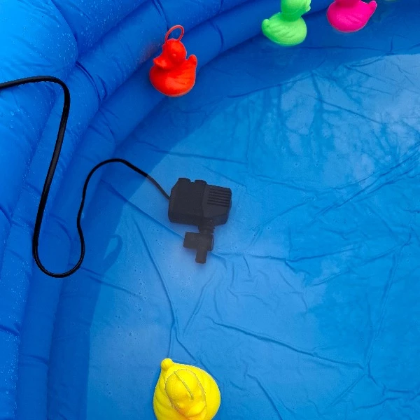 Het pompje kan dan in het water. Zorg dat deze ongeveer 20 cm vanaf de rand ligt en schuin in de richting dat het water moet gaan. Doe het pompje pas aan als deze in het water ligt! De eendjes zullen dan langzaam rondgaan. Zorg ervoor dat de stroomhaspel of kabel 2 meter van het zwembad verwijderd is. De kabel is lang genoeg, dus dit moet normaal geen probleem zijn.