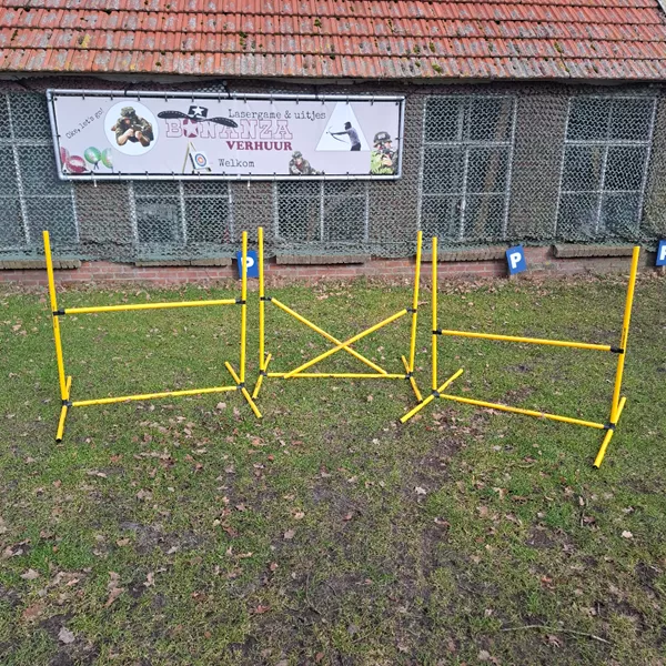 Bij het huren van dit pakket ontvang je 3 hobbyhorses (paardjes) en 3 gele springhordes, zoals afgebeeld. De hordes zijn eenvoudig te verplaatsen en in hoogte aan te passen, waardoor kinderen hun eigen parcours kunnen bouwen. Rennen, springen en oefenen maar!