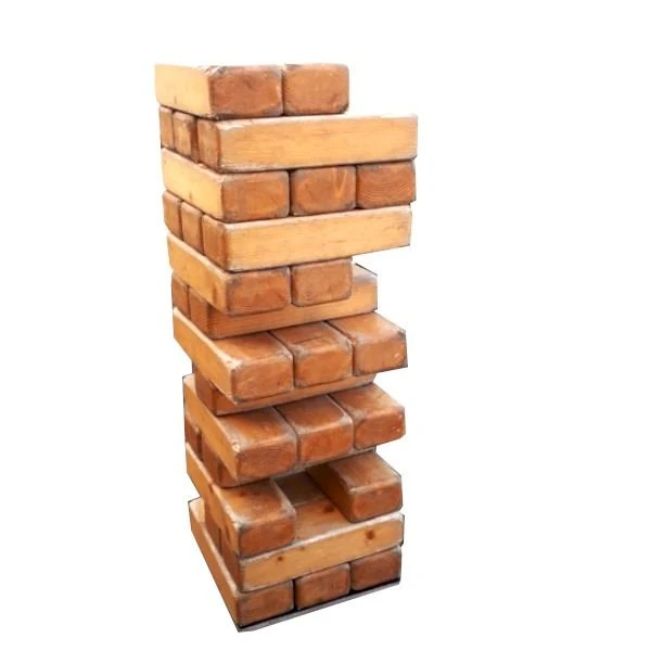 Dit is de GROTE versie van het spel "Jenga". Probeer zoveel mogelijk blokken er tussen uit te halen. Dit blok moet dan weer bovenop gelegd worden.