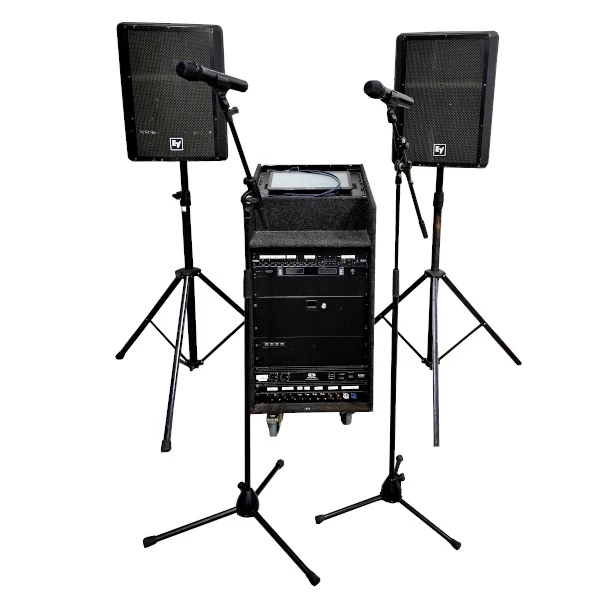 De karaoke apparatuur bestaande uit: Twee krachtige speakers, 2 microfoons en een tablet met de teksten. Wilt u hier een extra scherm bij? Dit kunt u er eenvoudig bij huren in de winkelwagen!
