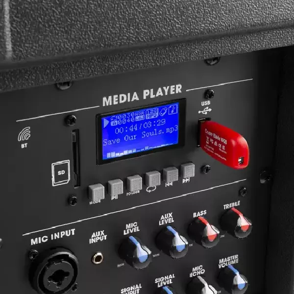 - 🎚️ Aansluitingen voor microfoon, mixer en mediaspeler