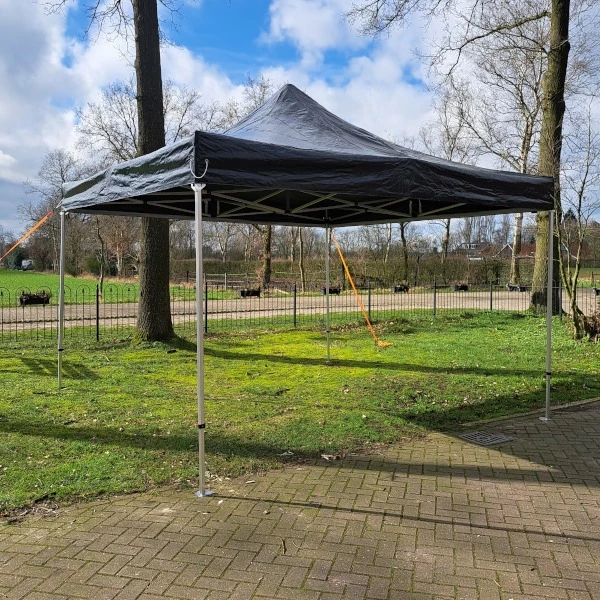 Deze easy up partytent (ook wel vouwtent of harmonica tent genoemd) is snel en eenvoudig op te zetten. De tent kan in één beweging worden uitgeschoven. Wij adviseren om dit met minimaal twee personen te doen.