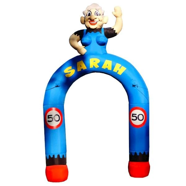 Deze opblaasbare Sarah boog wordt vaak gebruikt voor de entree van het 50 jarige feest of juist gewoon in de tuin met het spandoek tussen de benen!