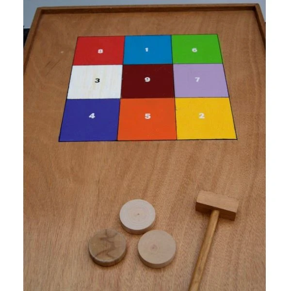 Sla met de hamer 3 schijven op het bord en probeer zoveel mogelijk punten te halen. Probeer de stenen dus met het hamertje weg te stoten in het raam.