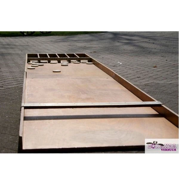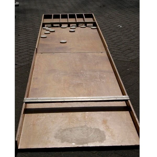 De reuze sjoelbak bestaat uit 2 delen van 2,5 meter.