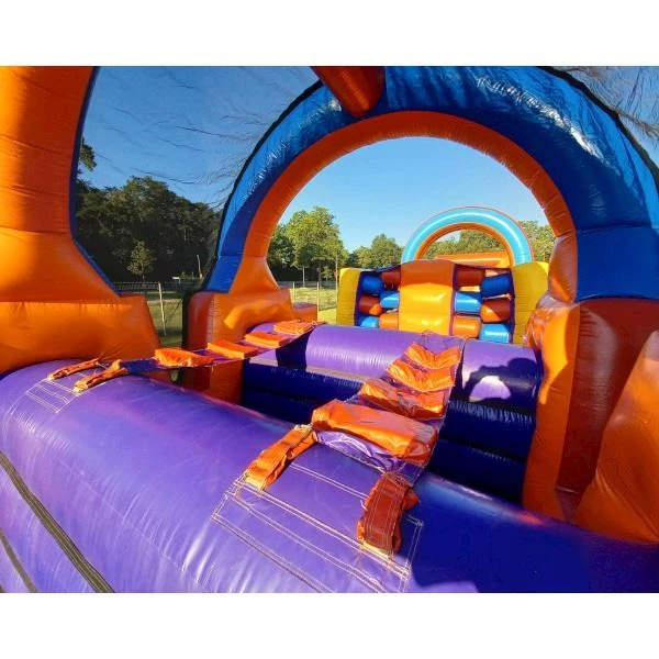 Een stormbaan van 22 meter die uniek is! De stormbaan bestaat uit 2 onderdelen: Worstelbrugbaan & Wirwar stormbaan.
