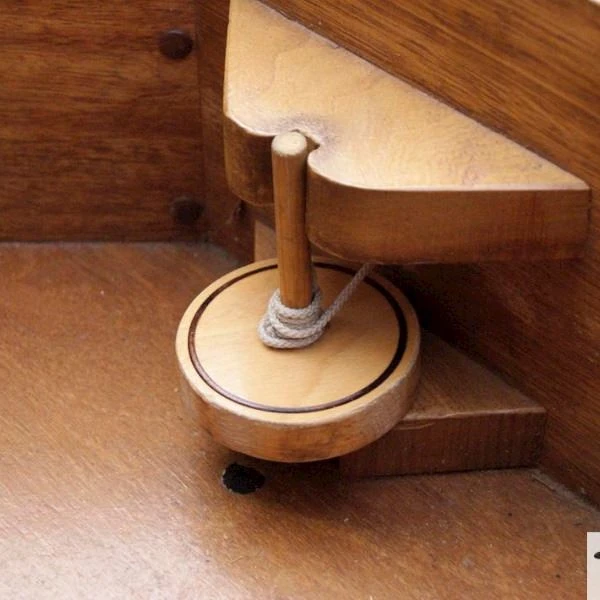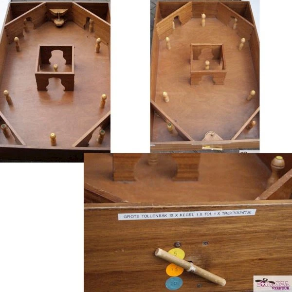 Plaats alle 10 kegels op de daarvoor bestemde gekleurde stippen. Draai het touw om de tol heen door het gat. Trek hierna met een stevige ruk aan het koord van de tol. De tol zal zijn weg vinden in de bak, en een aantal kegels omstoten.