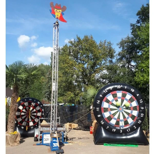 Voetbaldarts is een bord van 3 meter hoog en 3 voetballen. Een leuk spel voor een voetbalclub! Darten & voetballen gecombineerd.