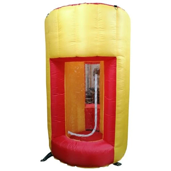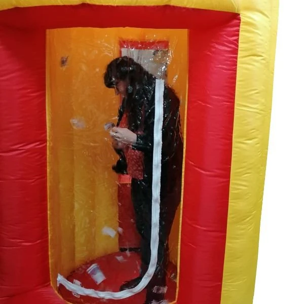 De wervelwindmachine is een grote opblaasbare machine waar je in kunt staan en briefjes kunt vangen (geld, nepgeld of iets anders).